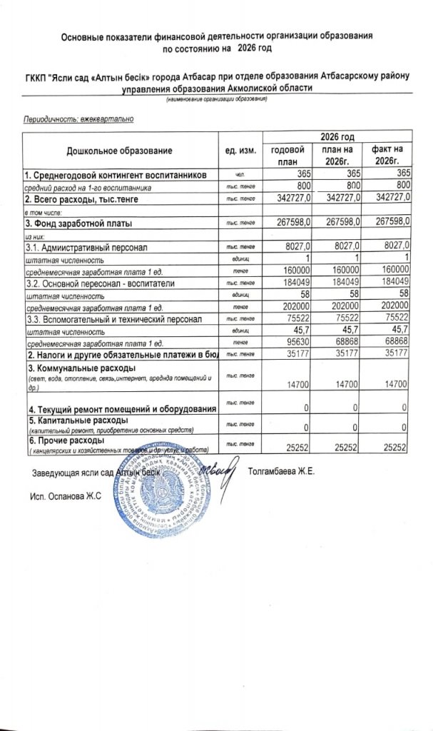 Білім беру ұйымының 2026 жылға арналған қаржылық қызметінің негізгі көрсеткіштері
