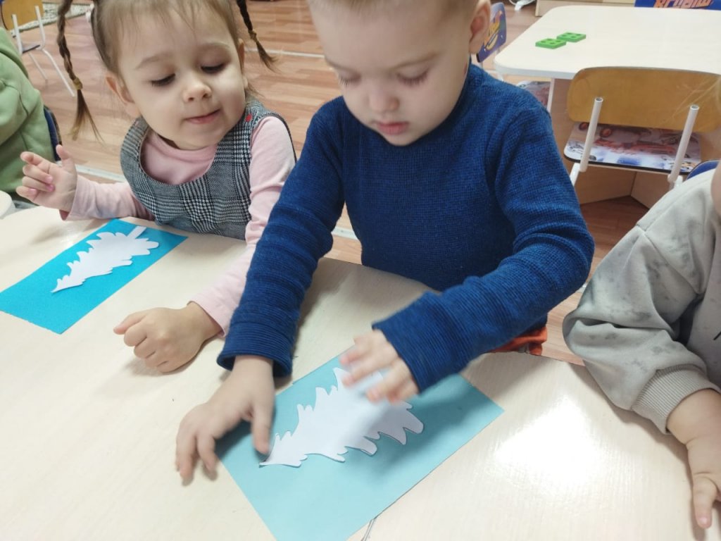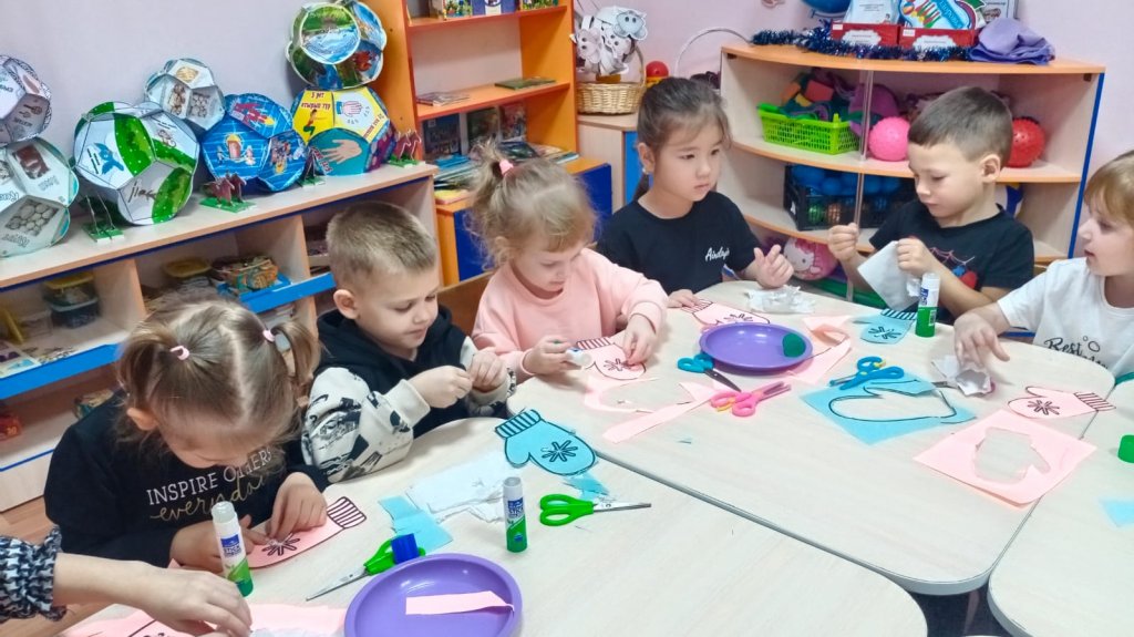 Олар қағаздан қолғаптарды қиып, үзіп жапсыру (обрывная аппликация) техникасы арқылы қар ұшқындарымен безендірді.