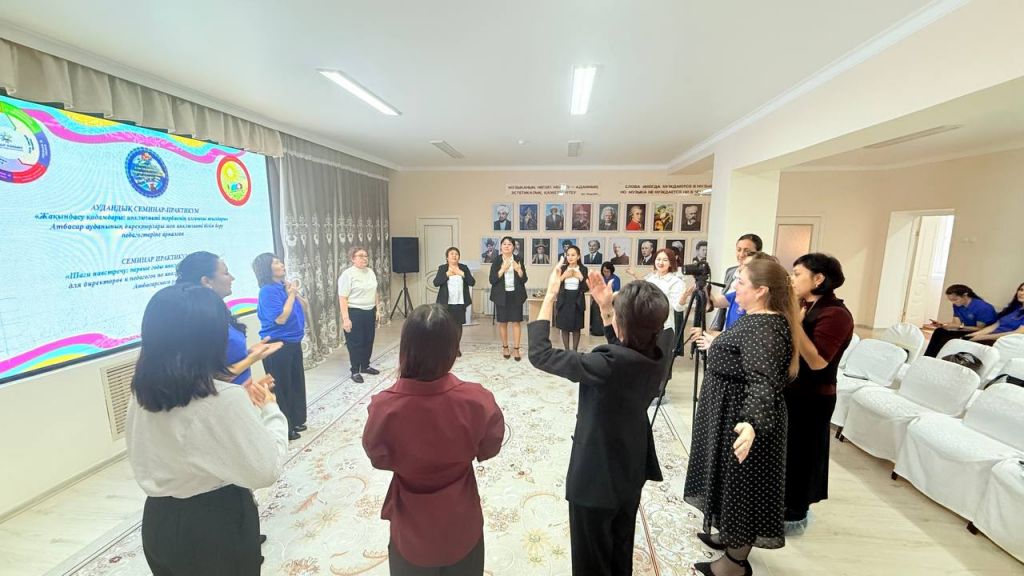 "Бәріміз бір әлемдіз" тренингі-Раисова Аймарал Шылмырзайқызы және Маженова Карина Бақтиярқызы. Педагогтардын бірлік пен өзара түсіністік тәжірибесін өмір сүрді. Жаттығу команданың күшін сезінуге, бір-бірін естуге және мейірімділік пен қабылдау атмосферасын құруға үйретті.
