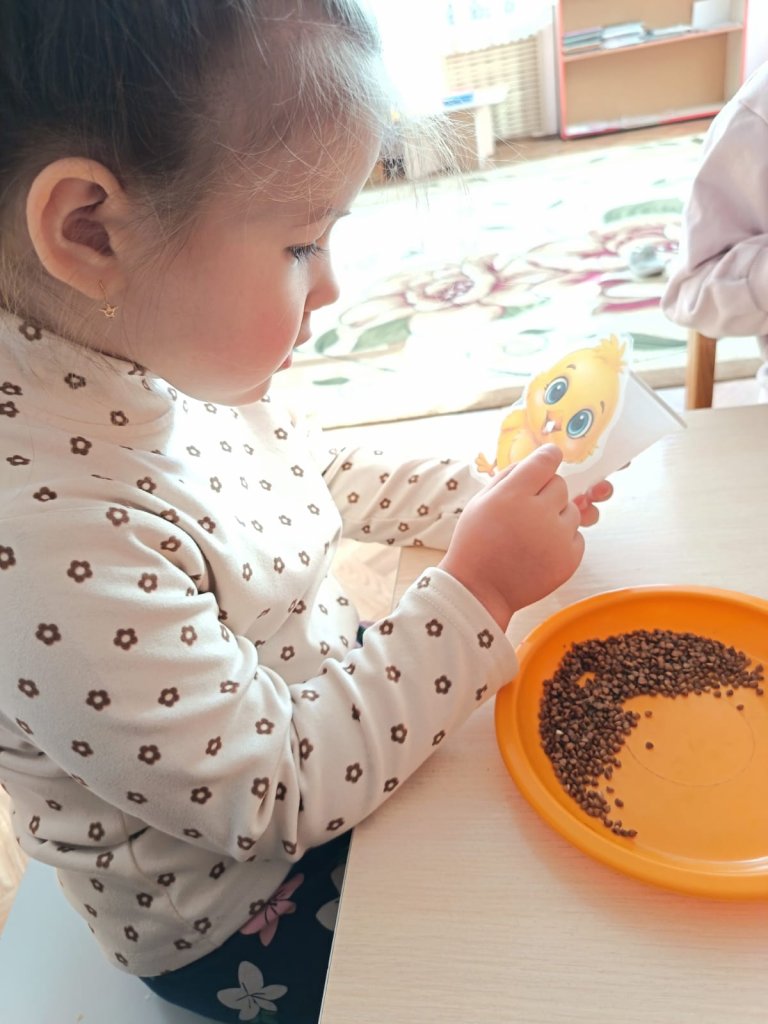 Балалар кішкентай тауықшаларды дәнмен тамақтандыруға үлкен қызығушылықпен және қамқорлықпен қатысты, «азықтарын» ұқыпты себуге тырысты. Кішкентайлар назар, ұқыптылық танытып, ойыннан қуаныш алды.