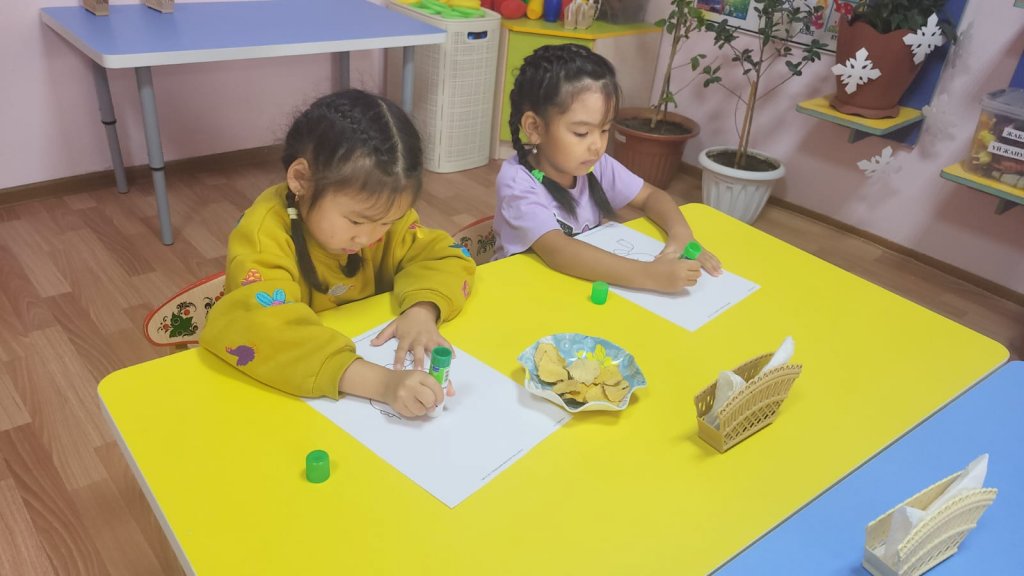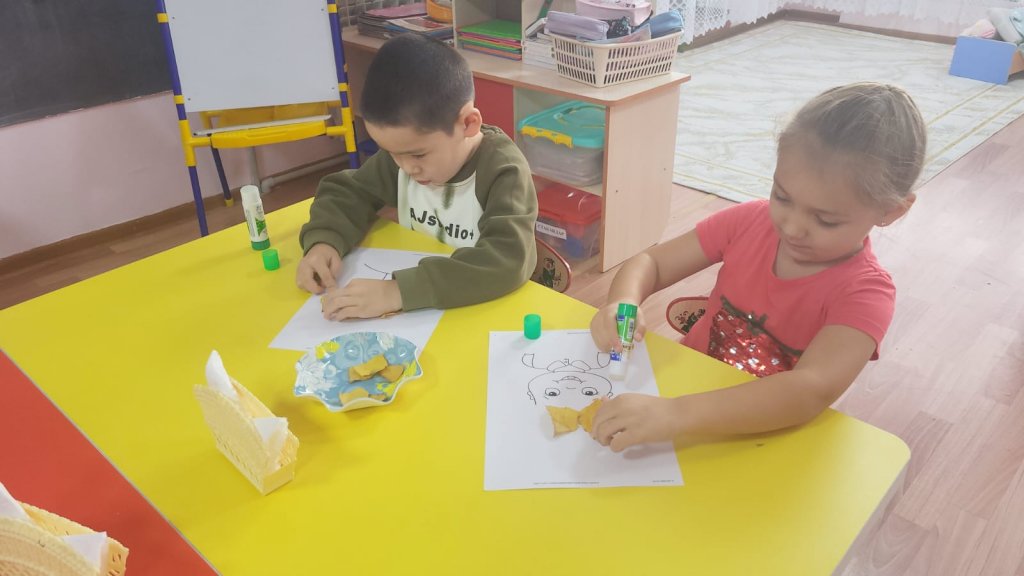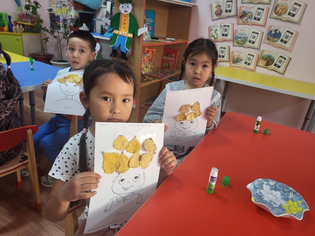Мектепалды: "Күн сәулелері" тобының балалары дайын суреттегі бастың үстіне кұзгі жапырақтарды қойып, шаш үлгісін жасады. Мақсаты: Үсақ қол моторикасын жетілдірдіру. Табиғат материалдарың қолдана отырып әсемдікке тазалыққа тәрбиелеу. Күз мезгілі мен жапырақтар туралы түсінігін кеңейту.
