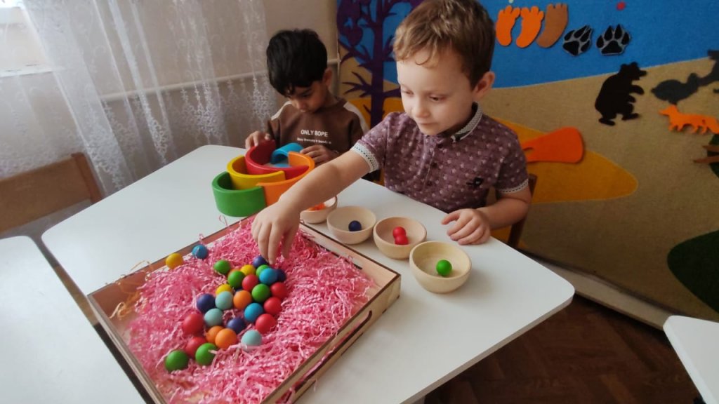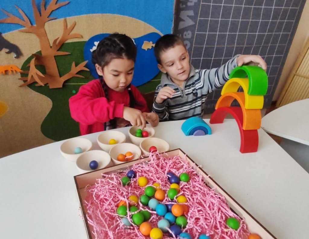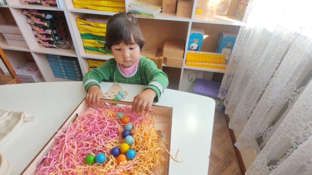 Түрлі-түсті шарлармен жұмыс қозғалыс үйлесімділігін және заттарды түстеріне қарай бөлу қабілетін дамытуға көмектеседі.