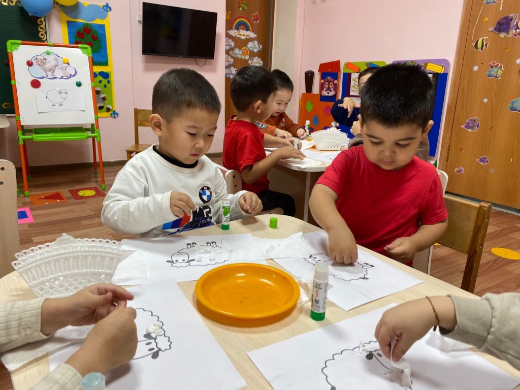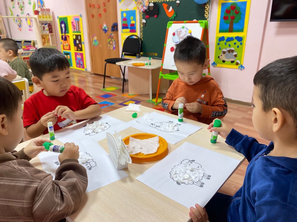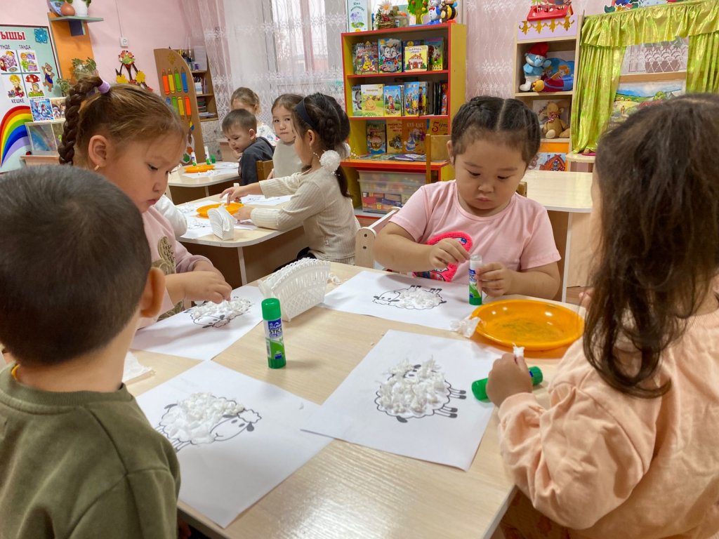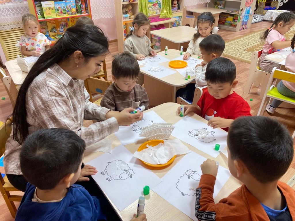Қағаз бөліктерін «үйкелеу–жапсыру» тәсілі арқылы қолдың ұсақ моторикасын дамыту. Зейінін, көру қабылдауын, пішін мен түсті салыстыру қабілетін дамыту.