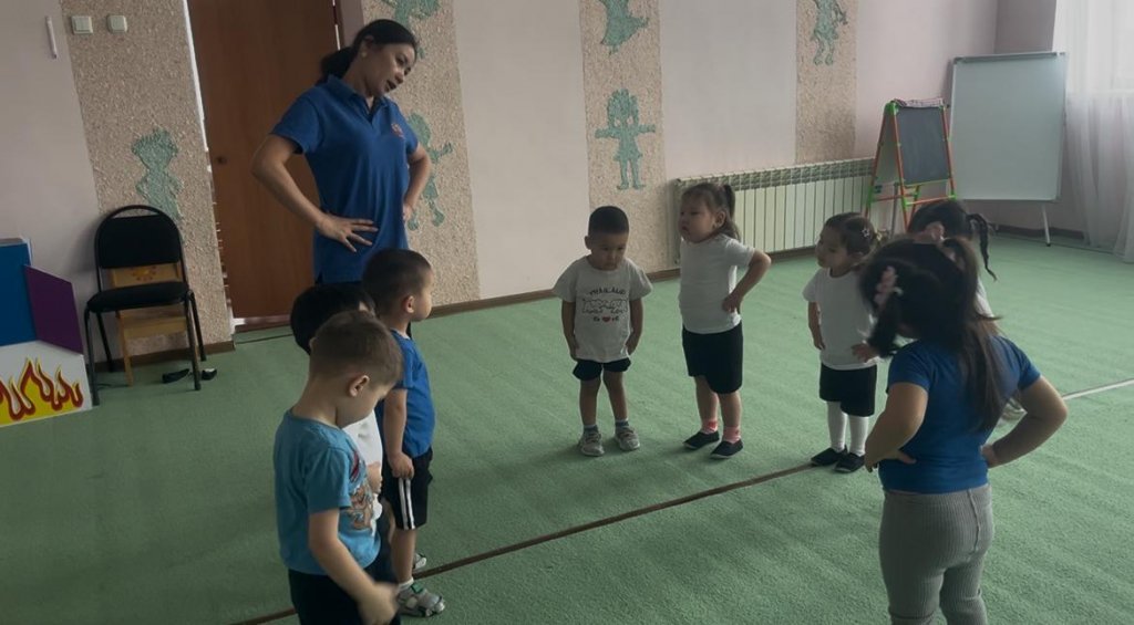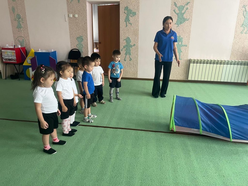 Кіші сәби тобының балалары дене тәрбиесі сабағына белсенді қатысып, көңілді жаттығулар орындады , балалар қуана-қуана жаттығып, сергіп қалды