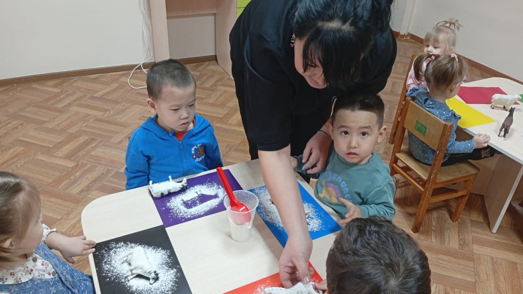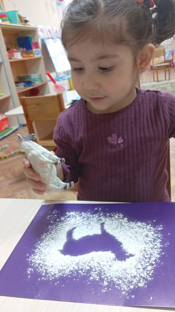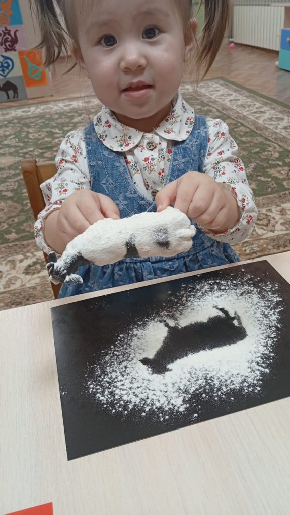 Мақсаты:Балаларды үй жануарларымен таныстыру, оның сыртқы ерекгеліктерін ажырата білуге үйрету. Саусақтың ұсақ моторикасын дамыту ұн себу, сипау арқылы. Қарапайым шығармашылық әрекетке қызығушылығын арттыру. Зейінін, көру-қимыл үйлесімділігін дамыту. Табиғи материалдармен ұқыпты жұмыс жасауға дағдыландыру.