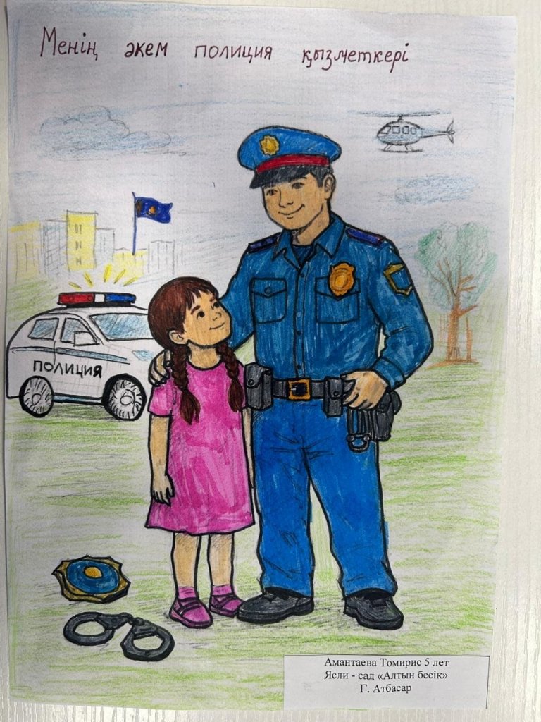 Ақмола облысы білім басқармасының «Әдістемелік орталығы» КММ-нің мектеп жасына дейінгі балалар арасында «Заң және тәртіп» идеологемасы аясында өткізілген «Менің әкем – полицей» атты көрме туралы ережесіне сәйкес, ересек және мектепалды топ тәрбиеленушілері арасында сурет көрмесі ұйымдастырылды.