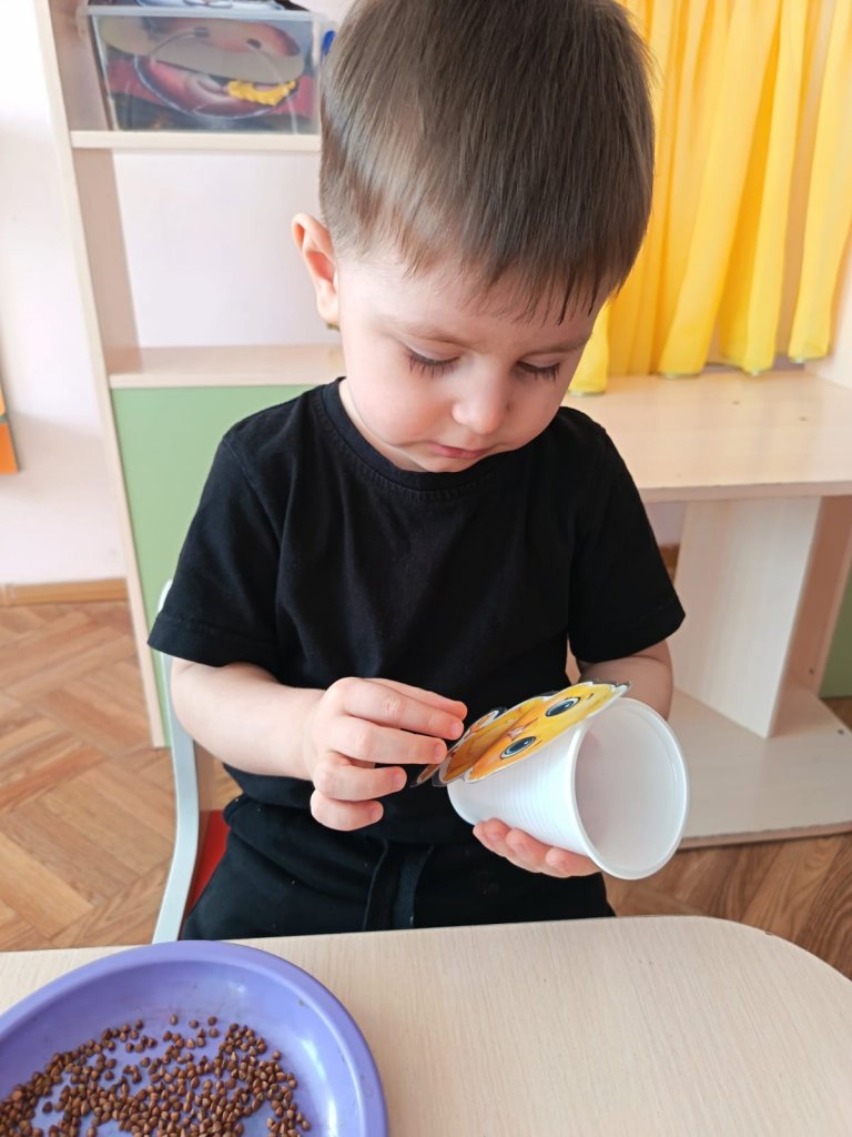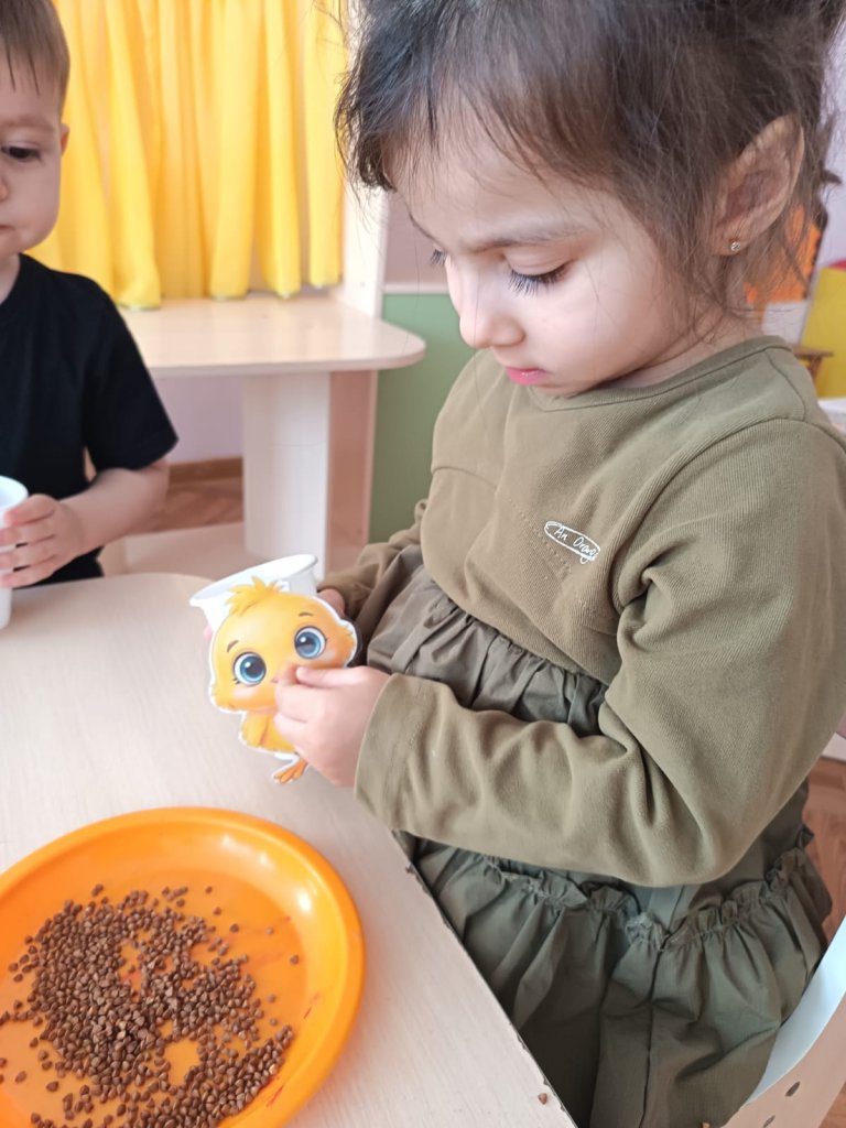 Балалар кішкентай тауықшаларды дәнмен тамақтандыруға үлкен қызығушылықпен және қамқорлықпен қатысты, «азықтарын» ұқыпты себуге тырысты. Кішкентайлар назар, ұқыптылық танытып, ойыннан қуаныш алды.