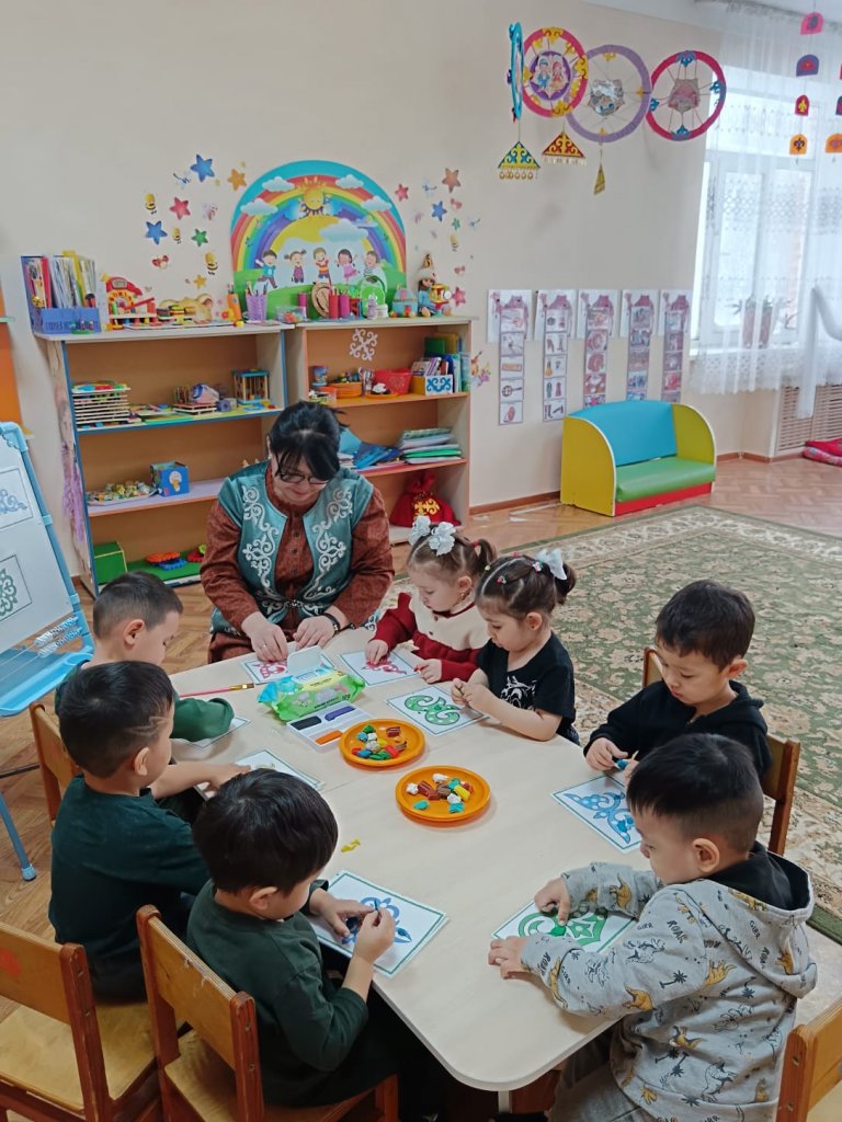 Мақсаты: Балаларды қазақтың ұлттық ою-өрнегімен таныстыру. Ермексазды пайдаланып, оюдың үстіне дөңгелек пішіндер жапсыру арқылы балалардың ұсақ моторикасын, шығармашылық қабілетін және түстерді ажырату дағдыларын дамыту. Ұқыптылыққа, әсемдікке тәрбиелеу.