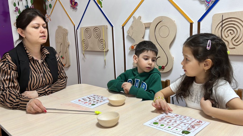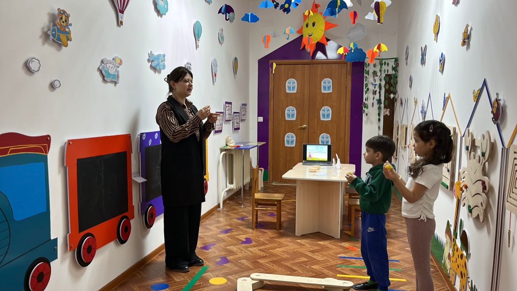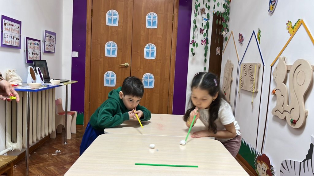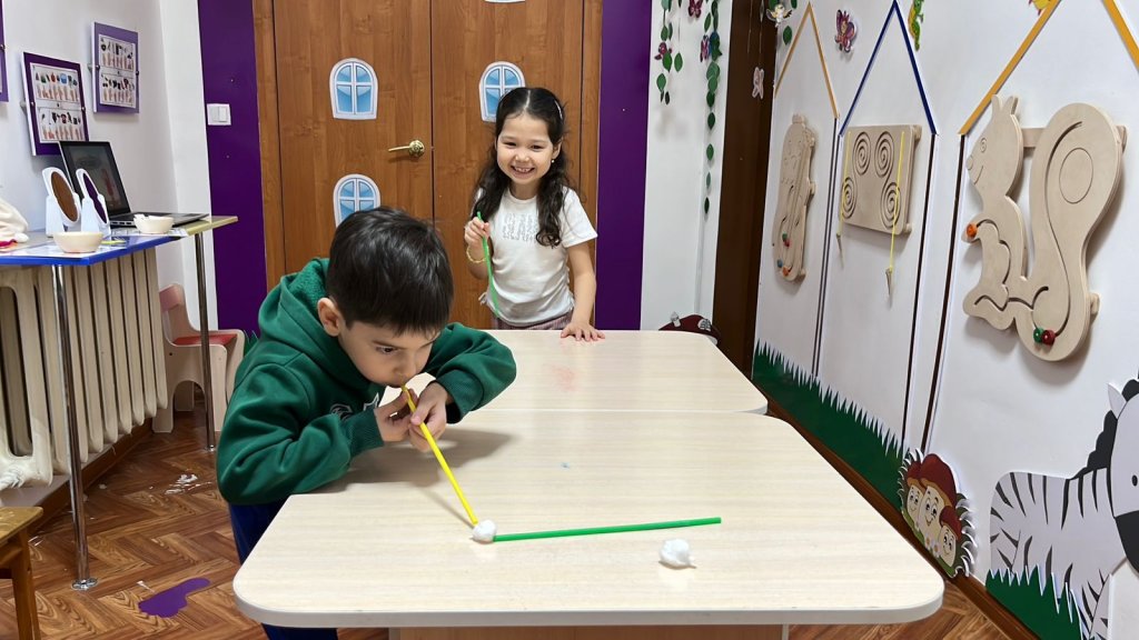 Одан кейін «Көңілді тіл туралы ертегі» түрінде артикуляциялық жаттығулар жасадық — балалар қызығушылықпен орындап, тілдің «саяхаттауына» көмектесе отырып, оны икемді әрі мықты етті.