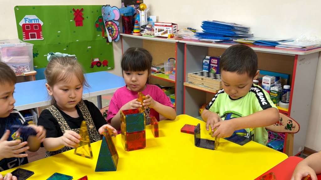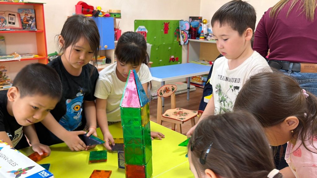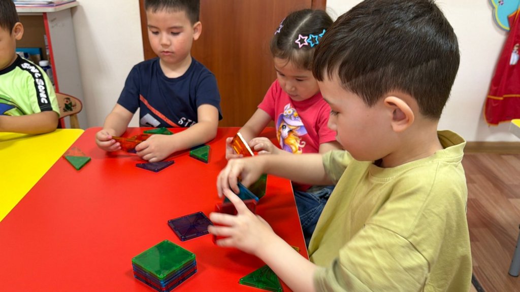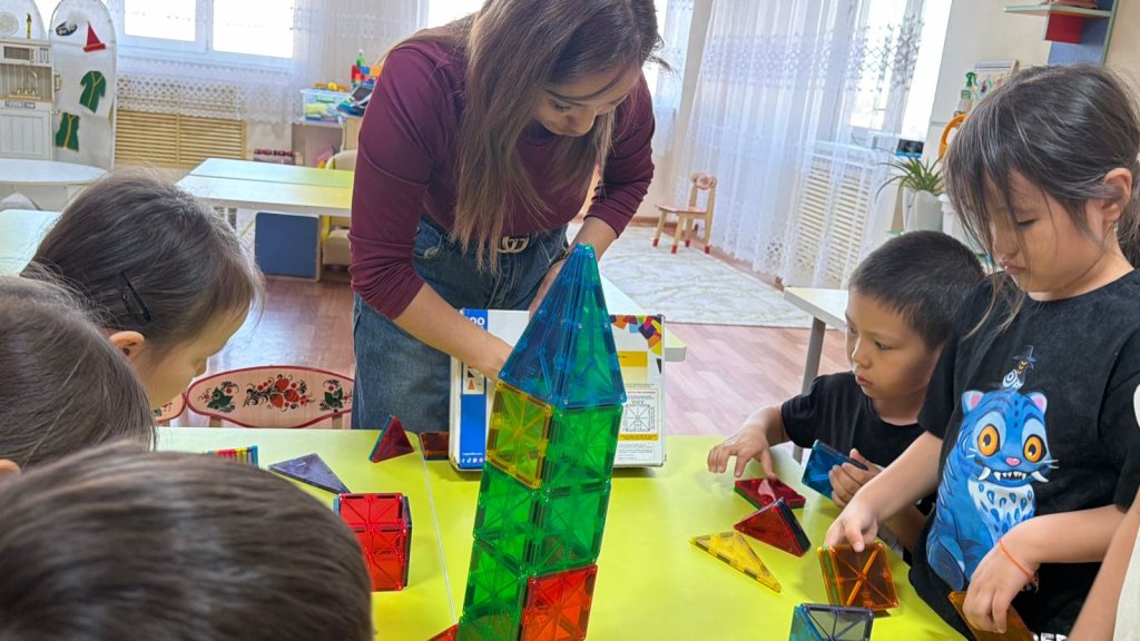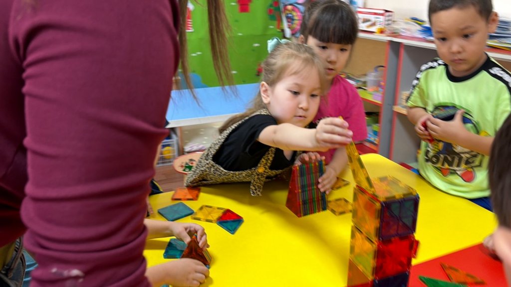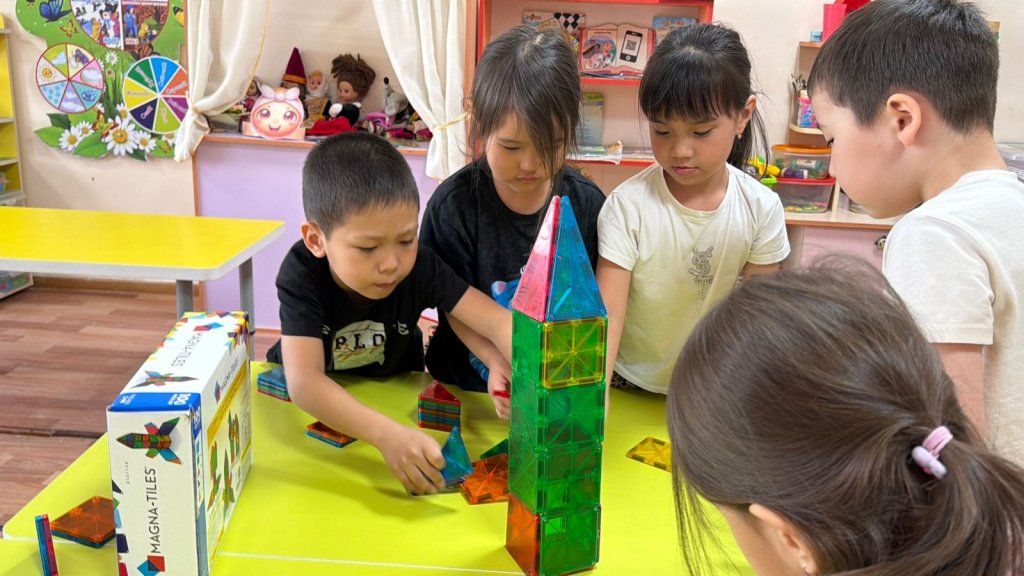 Бүгінгі оқу іс-әрекетінде балалар магниттік конструктормен жұмыс жасап, өз қиялдарын іске қосты Құрастыру арқылы олар кеңістіктік ойлауын дамытып, магнетизм қасиеттерімен танысты.